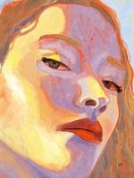 Dit portret in paarsachtige en blauwe tinten maakt deel uit van 3 schilderijen in dezelfde stijl. Een close up en een vrouw in een groene jurk horen bij deze serie.