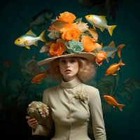 Een kunstwerk van een vrouw met elegante kleding, omringd door vissen in de stijl van surrealistische droomlandschappen. Tegen een achtergrond van donker blauwgroen water. De algehele compositie is symmetrisch en in balans, waardoor een elegant tafereel ontstaat dat de schoonheid van de natuur combineert met surrealistische elementen.