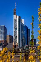 De foto toont de Commerzbanktoren in de zon. Omkaderd door een forsythia die in het geel bloeit. De Toren maakt deel uit van de skyline van Frankfurt en is een van de meest spectaculaire gebouwen in Frankfurt. U kunt ook de IJzeren Brug en de rivier de Main zien.