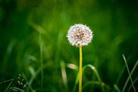 Zonovergoten ronde paardenbloem op een felgroene achtergrond van gras. Lentebloemenseizoen.
