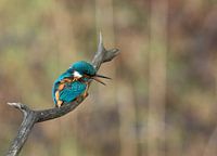 Ijsvogelvrouwtje die het mannetje vanaf een tak in het water uitdaagt!