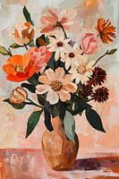 Complementairende kleuren in Perzik en Groen toont een levendige compositie van bloemen, geschilderd met een paletmes in een expressieve, dynamische stijl. De opvallende terra kleurige vaas vormt het middelpunt, waarin delicate roze rozen en stralende roze tulpen, bruine dahlias en wit en beige margrietjes elkaar omarmen in een harmonie van aardse tinten. De bloemen lijken bijna uit de vaas te springen, hun bloemblaadjes zijn dik aangebracht met verf, wat textuur en beweging creëert. De licht hemels en perzikgroene achtergrond zorgt voor een luchtige, serene sfeer, die het geheel in balans brengt en de mooie kleuren laat schitteren.