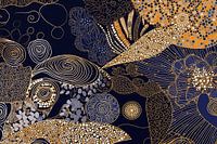 Dit werk toont een ingewikkelde verzameling van patronen en vormen in goud en oranje, weergegeven tegen een diep donkerblauwe achtergrond. De verschillende elementen, waaronder cirkels, lijnen en stippen, zijn organisch met elkaar verweven en creëren een gevoel van diepte en dynamiek.