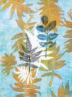 Deze botanische monotype of monoprint is gemaakt met een gelliplate en acrylverf. Een uniek handgemaakt en eenmalig werk, er kan maar 1 afdruk worden gemaakt van je ontwerp. Door de grafische druktechniek en het gebruikte papier ontstaan er allerlei structuren en effecten. Bij dit werk heb ik bloemetjes, planten, bladeren en grassen geplukt en deze in de verf gedrukt. Door meerdere keren over elkaar te drukken ontstaat dit unieke werk. Doordat er wit is uitgespaard houdt het werk zijn frisheid. De achtergrond is blauw met oranje bladvormen. Op de voorgrond een zwart en een donkerblauw blad van een boom. Daartussen witte silhouetten van bladeren. Een werk met een rustige uitstraling