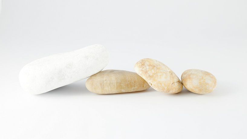 Een beeld van de schoonheid van rust en eenvoud, een stilleven van enkele kiezelstenen. De stenen zijn verschillend van vorm en kleur. De contrasten tussen de texturen en kleuren van de kiezelstenen komen mooi tot hun recht in de lichte omgeving.