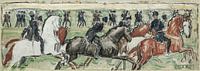 Compositiestudie voor "Jena 1813". Op de voorgrond staan drie ruiters op het rode, zwarte en witte paard in de beweging. Op de achtergrond staan groepen mannelijke figuren in de uniformen. De achtergrond is okergroen