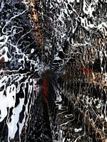 Abstract digitale gouache schilderij in blauw rood en oranje tinten met wit en zwart