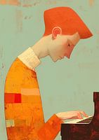 Concentratie Kunst | Silent Sonata - Dit mannen schilderij toont een jongeman met felrood haar in een oranjekleurige trui, geconcentreerd pianospelend, met een nadruk op de stilte en concentratie die de muziek hem brengt.