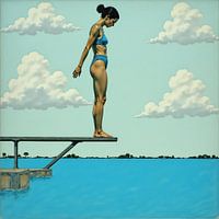De figuur in "Concentration for Diving" staat aan de rand van het bord en belichaamt een sereniteit die aan actie voorafgaat. Het schilderij vangt de diepe rust van een moment in de tijd, waar anticipatie en voorbereiding samensmelten tot een delicaat evenwicht. De vorm van de vrouw, gedefinieerd maar toch ontspannen, weerspiegelt de…