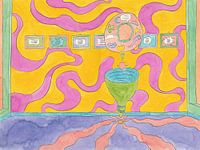 Dit werk maakt deel uit van mijn huidige reeks 'Denkbeeldige Kamers'. Deze reeks werken ben ik begonnen in november 2005 bij het bezoek aan een vriend die een surrealistisch schilderij aan de muur had hangen. Het gebruik van symbolen om te communiceren met de kijker nodigde me uit om deze reeks te beginnen.