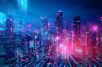 Conceptueel panorama van een skyline van een stad, verlicht door de gloed van neonlichten en digitale wereldelementen, legt de energie van het stadsleven vast.