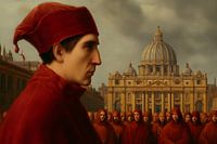 Op dit indrukwekkende olieverfschilderij in de stijl van Caravaggio staat een man in een felrood gewaad en bijpassende hoed tussen een groep kardinalen op het Sint-Pietersplein. Zijn blik is bedachtzaam en eerbiedig. Achter hem is de Sint-Pietersbasiliek te zien, die imposant oprijst op de achtergrond.