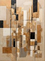 Dit abstracte kunstwerk speelt met geometrische vormen, subtiele lijnen en texturen, gecombineerd met een verfijnd palet van goudtinten, beige, zwart, wit en grijs. De combinatie van gladde en ruwe oppervlaktes, samen met gouden accenten, geeft het schilderij een moderne, luxueuze uitstraling. De verticale en horizontale lijnen creëren een harmonieuze balans tussen beweging en stabiliteit.