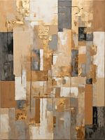Dit abstracte kunstwerk speelt met geometrische vormen, subtiele lijnen en texturen, gecombineerd met een verfijnd palet van goudtinten, beige, zwart, wit en grijs. De combinatie van gladde en ruwe oppervlaktes, samen met gouden accenten, geeft het schilderij een moderne, luxueuze uitstraling. De verticale en horizontale lijnen creëren een harmonieuze balans tussen beweging en stabiliteit.