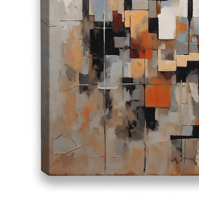 Dit digitale kunstwerk heeft een abstracte, geometrische compositie. Er zijn rechthoekige en vierkante vormen in verschillende maten gebruikt, die overlappen en elkaar soms breken, waardoor een dynamische en gelaagde textuur ontstaat. De kleuren bestaan voornamelijk uit neutrale tinten zoals beige, wit, en grijs, afgewisseld met…