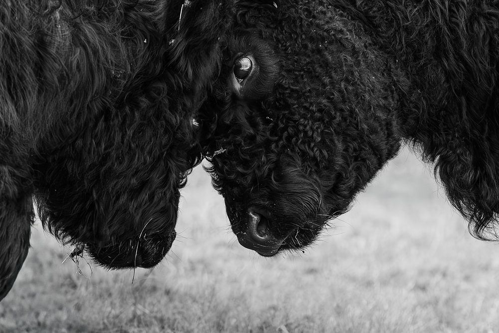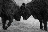 Deze indrukwekkende zwart-wit foto toont een krachtig moment tussen twee Galloway runderen, hun koppen tegen elkaar gedrukt in een intense confrontatie. Galloway runderen staan bekend om hun dikke, krullende vachten en robuuste bouw, wat duidelijk zichtbaar is in deze foto. De rijke textuur van hun vachten en de scherpe focus op hun ogen geven een gevoel van kracht en vastberadenheid weer. De zachte, vervaagde achtergrond benadrukt hun krachtige aanwezigheid. Deze foto is een prachtige toevoeging voor liefhebbers van dierenfotografie en rustieke taferelen. Perfect voor thuis, kantoor, of als uniek cadeau