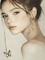 Op deze afbeelding zien we een jonge vrouw met een serene en dromerige uitstraling. Haar blik is zacht, bijna alsof ze in gedachten verzonken is, terwijl een delicate vlinder naast haar zweeft. De subtiele gouden oorbellen in de vorm van takjes en blaadjes voegen een vleugje verfijning toe, die perfect past bij de warme tinten van de vlindervleugels. De achtergrond is rustig en neutraal, waardoor alle aandacht naar het gezicht van de vrouw en het fragiele moment met de vlinder wordt getrokken. Dit schilderachtige tafereel straalt een gevoel van kalmte en verbondenheid met de natuur uit