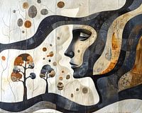 Figuratieve abstractie met als thema de connectie tussen mens en natuur in aardetinten met een hout structuur.