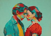 Connection Through Colorful Geometry - Dit kleurrijke vrouw en man schilderij toont twee figuren die innig naar elkaar kijken, met opvallende geometrische vormen en levendige kleuren die een gevoel van verbinding en liefde uitstralen.