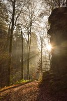 Een stralende winterzon bij een rotswand in de bossen nabij Consdorf, Luxemburg.