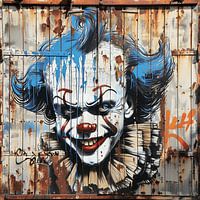 Een angstaanjagende clown grijnst duivels vanuit een verweerde metalen deur, zijn gezicht een mengeling van duistere komedie en dreigend gevaar. Het graffitikunstwerk maakt gebruik van de roestige oppervlakken als onderdeel van de textuur, terwijl verlopen spatten van blauwe en rode verf het beeld een wilde, dynamische energie geven. De…