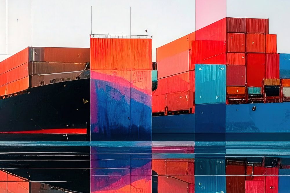 Twee grote vrachtschepen geladen met kleurrijke containers zijn afgebeeld met abstracte, geometrische overlays in levendige tinten, die een moderne digitale esthetiek weerspiegelen. De reflectie op het water voegt diepte toe, terwijl de kleurblokken een dynamische compositie creëren......Digital art image, ontwerp en compositie door mij, visualisatie met AI