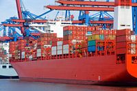 Container schepen afgemeerd bij de container terminal in de haven. De kranen boven het schip worden gebruikt om de schepen te laden en lossen.