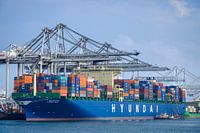 Container schip in de Amazonehaven op de Maasvlakte bij Rotterdam. De containers worden aan boord gebracht met de overhead kranen terwijl een bunkerschip brandstof aan boord pompt.