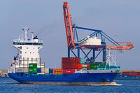 Vrachtschip met containers verlaat de haven van Rotterdam op een zonnige dag . De haven van Rotterdam is de grootste haven van Europa en één van de grootste containerhavens ter wereld ligt in het centrum van Rotterdam, Nederland .