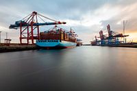 Waltershof haven in Hamburg bij zonsondergang. Containerschepen worden geladen.