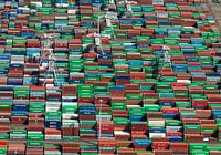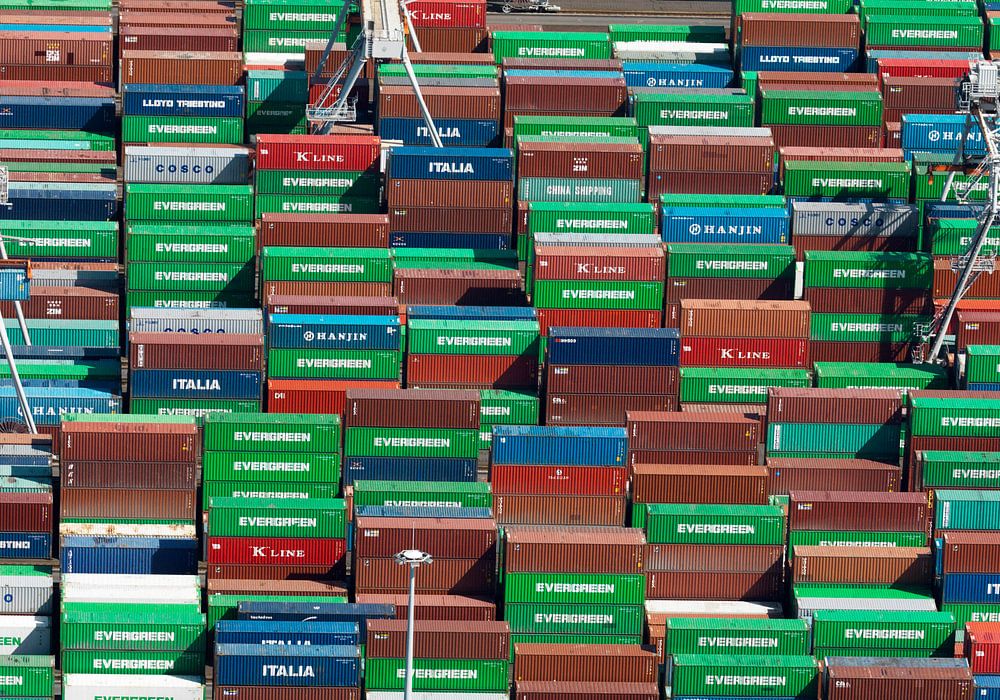 Containers op de containerterminal op de Maasvlakte te Rotterdam geven een kleurrijk afwisselend beeld met kleuren oranje, groen, blauw en wit.