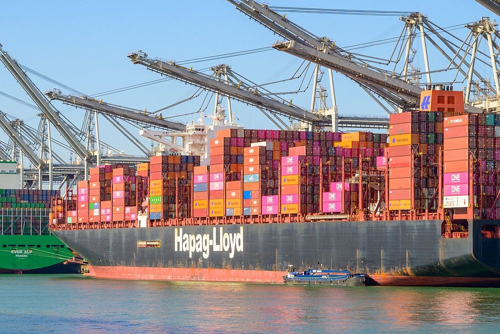 Containerschepen Ever Alp en Al Nefud liggen aangemeerd bij de containerterminal in de Rotterdamse haven tijdens een zonnige dag op de Maasvlakte vlakbij de Noordzee. De Ever Alp is een Evergreen A-klasse Post Suezmax / Post-Panamax containerschip gebouwd voor Evergreen Marine.