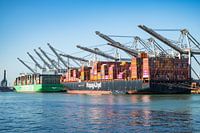 Containerschepen Ever Alp en Al Nefud liggen aangemeerd bij de containerterminal in de Rotterdamse haven tijdens een zonnige dag op de Maasvlakte vlakbij de Noordzee. De Ever Alp is een Evergreen A-klasse Post Suezmax / Post-Panamax containerschip gebouwd voor Evergreen Marine.
