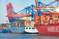 Vrachtcontainerschepen met zeecontainers aangemeerd bij de containerterminal in de haven van Hamburg tijdens een mooie zomerdag.