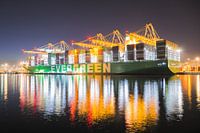 Containerschip aangemeerd bij de containerterminal in de haven van Rotterdam in Nederland bij nacht op de Maasvlakte vlakbij de Noordzee. De Ever Alp is een Evergreen A-klasse Post Suezmax / Post-Panamax containerschip gebouwd voor Evergreen Marine.