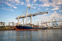 Ook een kleiner containerschip komt aan de kade om te lossen en te laden. Het enorme containerterminaal heeft een plekje voor dit schip. De containers op de havenkade De containerkranen boven het schip. De wolken aan de blauwe lucht. Op de achtergrond worden containers verplaatst gaan ze op…