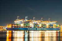 Containerschip Cosco Shipping Scorpio van Cosco Shipping Lines is 's nachts aangemeerd bij de containerterminal in de haven van Rotterdam in Nederland op de Maasvlakte vlakbij de Noordzee.