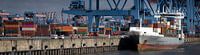 Op deze foto zie je een containerschip afgemeerd aan een terminal in de haven van Hamburg voor de karakteristieke blauwe laadkranen. De kleurrijke opstelling van de containers en de sterke structuren van de kranen onderstrepen de drukke sfeer van dit logistieke centrum. Ideaal voor thema's als wereldhandel, scheepvaart, logistiek en de maritieme economie. Het beeld straalt efficiëntie, productiviteit en het internationale netwerk van handelsroutes uit.