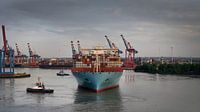Op de foto is een groot containerschip te zien dat door verschillende sleepboten in de haven wordt gemanoeuvreerd. Kleurrijke containerkranen torenen uit op de achtergrond, terwijl windmolens de combinatie van industrie en duurzame energie symboliseren. Het tafereel geeft een indrukwekkend beeld van wereldhandel en logistiek in actie. De kalme waterwegen en bewolkte lucht creëren een rustige maar dynamische sfeer. Dit beeld is perfect voor reclamecampagnes, redactionele stukken of presentaties over onderwerpen als scheepvaart, transport en zaken, en weerspiegelt efficiëntie en onderlinge verbondenheid in de moderne wereld.