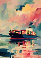 Dit impressionistische schilderij toont een groot containerschip dat over kalm water glijdt. De donkerblauwe romp en het rode en gele dek dragen rijen kleurrijke containers in rood, geel, blauw en groen. Het water weerspiegelt de kleuren van het schip en de lucht, die zachtjes overgaat van roze en geel naar blauw. Zichtbare, zachte penseelstreken geven beweging en sfeer aan het hele beeld. De lucht met zijn pastelkleurige wolken creëert een rustgevende, maar kleurrijke achtergrond die het schip centraal stelt.