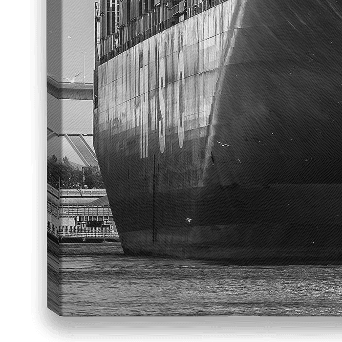 Deze expressieve zwart-witfoto toont een imposant vrachtschip dat majestueus in de haven ligt. Op de voorgrond ondersteunt een kleine sleepboot het gigantische containerschip, waarvan het dek geladen is met gestapelde vrachtcontainers. Industriële kranen en haveninfrastructuur op de achtergrond benadrukken de dimensies van wereldwijde…