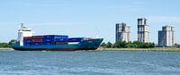 Een containerschip op de Nieuwe Waterweg met op de achtergrond de drie Waterwegtorens in Maassluis.