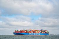 COSCO SHIPPING LEO Containerschip van COSCO SHIPPING Lines verlaat de haven van Rotterdam voor open zee. Het schip is gevuld met hoog opgestapelde zeecontainers, zowel aan de voor- als achterzijde van het grote schip