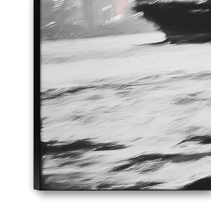 De monochrome foto toont een donker schip dat in de haven op kalm water ligt. Kleine golven en zachte reflecties op het wateroppervlak benadrukken de textuur en beweging. Het schip is horizontaal georiënteerd, met de romp, het dek en de opbouw zichtbaar. Op de achtergrond strekt de haveninfrastructuur met kranen, magazijnen en verticale structuren zich uit, waardoor diepte en context ontstaan. De diffuse lichtomstandigheden en grijze tinten creëren een kalme, sfeervolle stemming. De opname concentreert zich op de interactie tussen schip, water en havenarchitectuur en benadrukt op subtiele wijze de industriële omgeving.