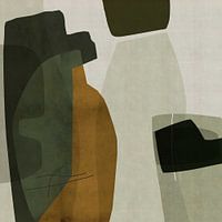 Abstracte compositie van gelaagde, geometrische vormen in een gedempt kleurenpalet. De deels organische, deels lineaire vormen overlappen elkaar en werken op elkaar in tegen een neutrale, crèmewitte achtergrond met een licht gestructureerd oppervlak. De dominante kleuren zijn olijfgroen, mosterdgeel-bruin en een donkerder,…