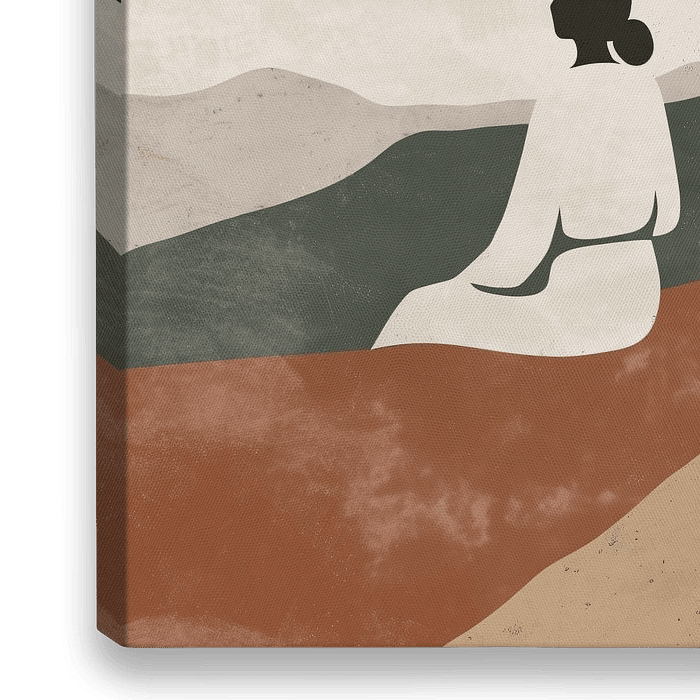 Ontdek de serene schoonheid van minimalistische kunst met dit elegante ontwerp. Een vrouwelijke figuur, weergegeven in eenvoudige, vloeiende lijnen, zit contemplatief onder een grote ronde vorm die een zon of maan kan voorstellen. De zachte, aardse tinten van bruin, beige en groen creëren een rustgevend palet, terwijl de gedempte…