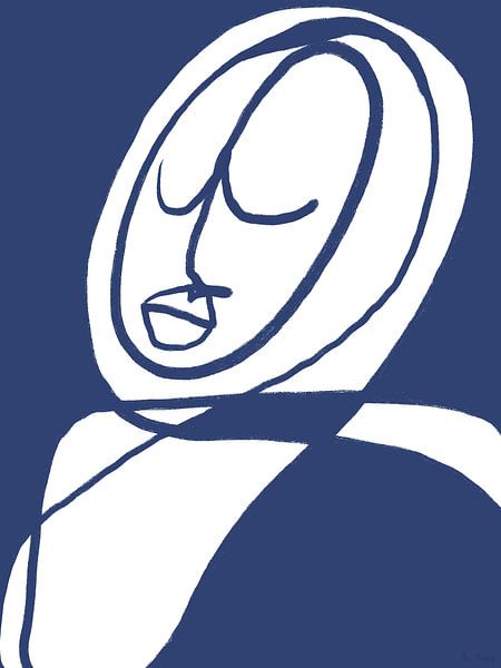 Dit werk is een voorbeeld van hoe weinig je nodig hebt om veel te zeggen. Met slechts een paar vloeiende, expressieve lijnen wordt een gestileerd gezicht gesuggereerd: ogen gesloten, een vol paar lippen, alsof de figuur midden in een rustige gedachte of zachte mijmering is. De diepe, matte blauwtint vormt een sterke achtergrond én vult…