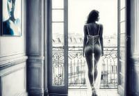 De vrouw, een beeld van gratie en diepte, lijkt verzonken in gedachten, terwijl de stad haar onverdeelde aandacht heeft. De open deuren suggereren een uitnodiging tot introspectie en een verbinding met de buitenwereld die zowel fysiek als metaforisch is. Haar silhouet tegen de Parijse skyline vormt een poëtische harmonie met de monochrome tinten van haar omgeving, waardoor een tijdloze sfeer ontstaat.