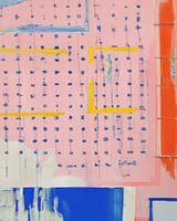 Contemporary abstract in pastel en warme kleuren. Ik hoop dat jij net zo vrolijk wordt van dit werk bij jou aan de muur als ik werd bij het maken hiervan. Abstract mixed media werk in roze, oranje, blauw en geel. Eclectisch en warm.