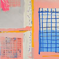 Contemporary abstract in pastel en warme kleuren. Ik hoop dat jij net zo vrolijk wordt van dit werk bij jou aan de muur als ik werd bij het maken hiervan. Abstract mixed media werk in roze, wit, blauw en geel. Eclectisch en warm.